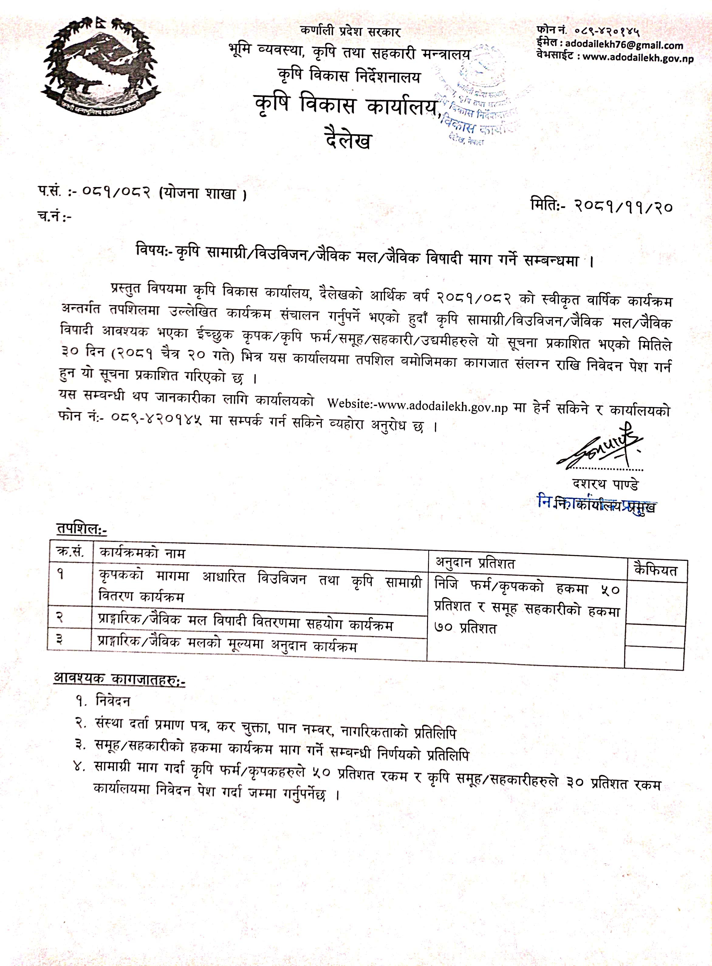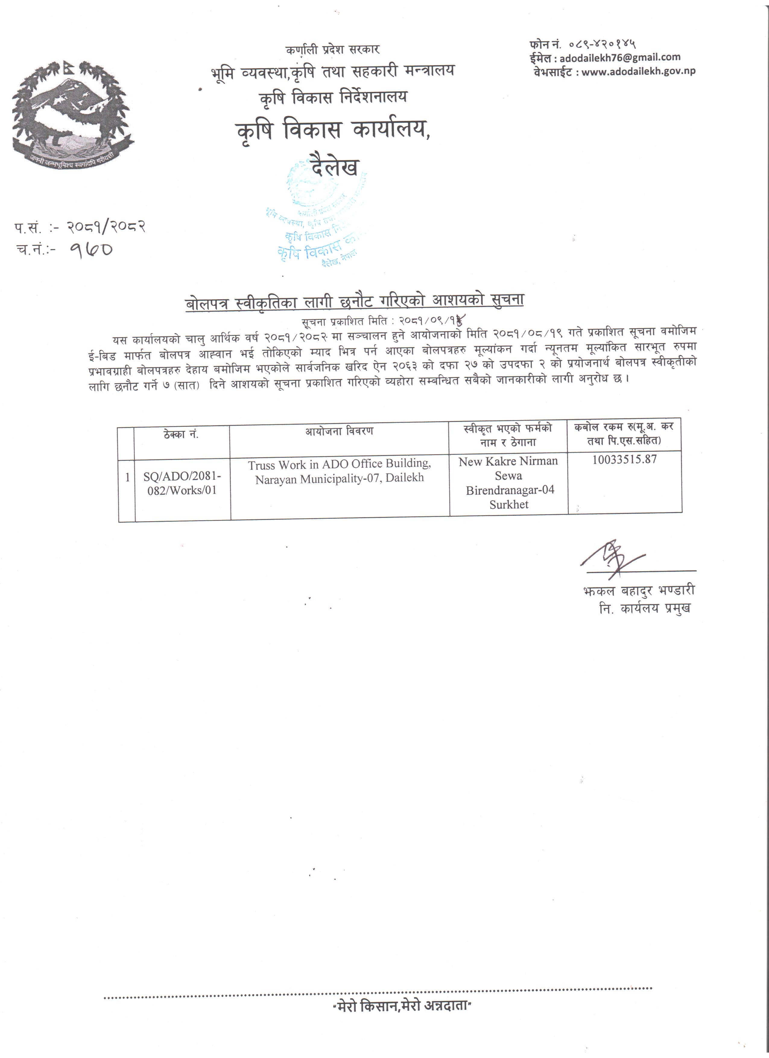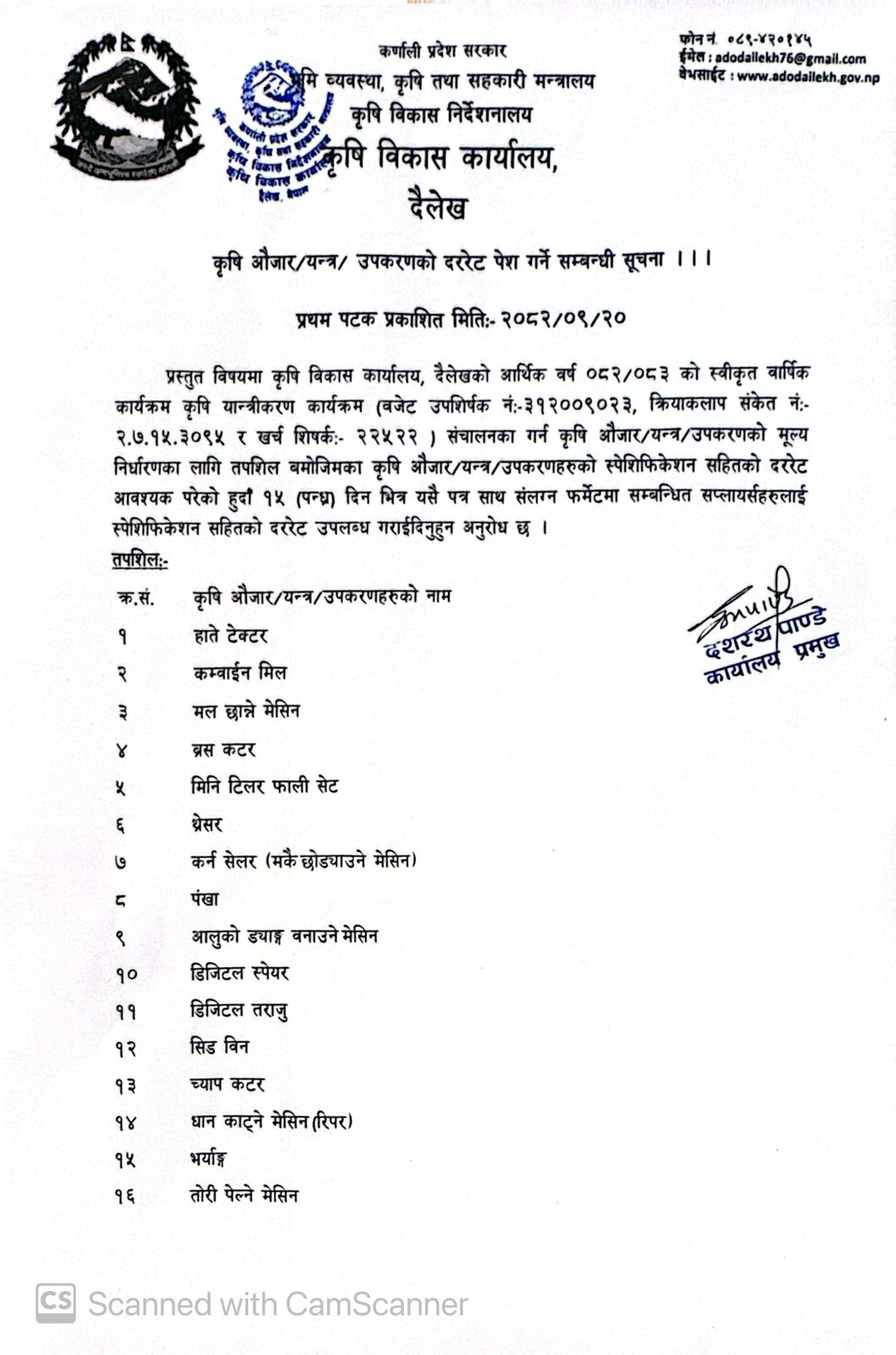 | कृषि औजार/यन्त्र/उपकरणको दररेट पेश गर्ने सम्बन्धी सूचना | 2082-09-20 | ||